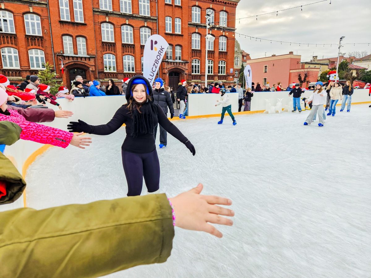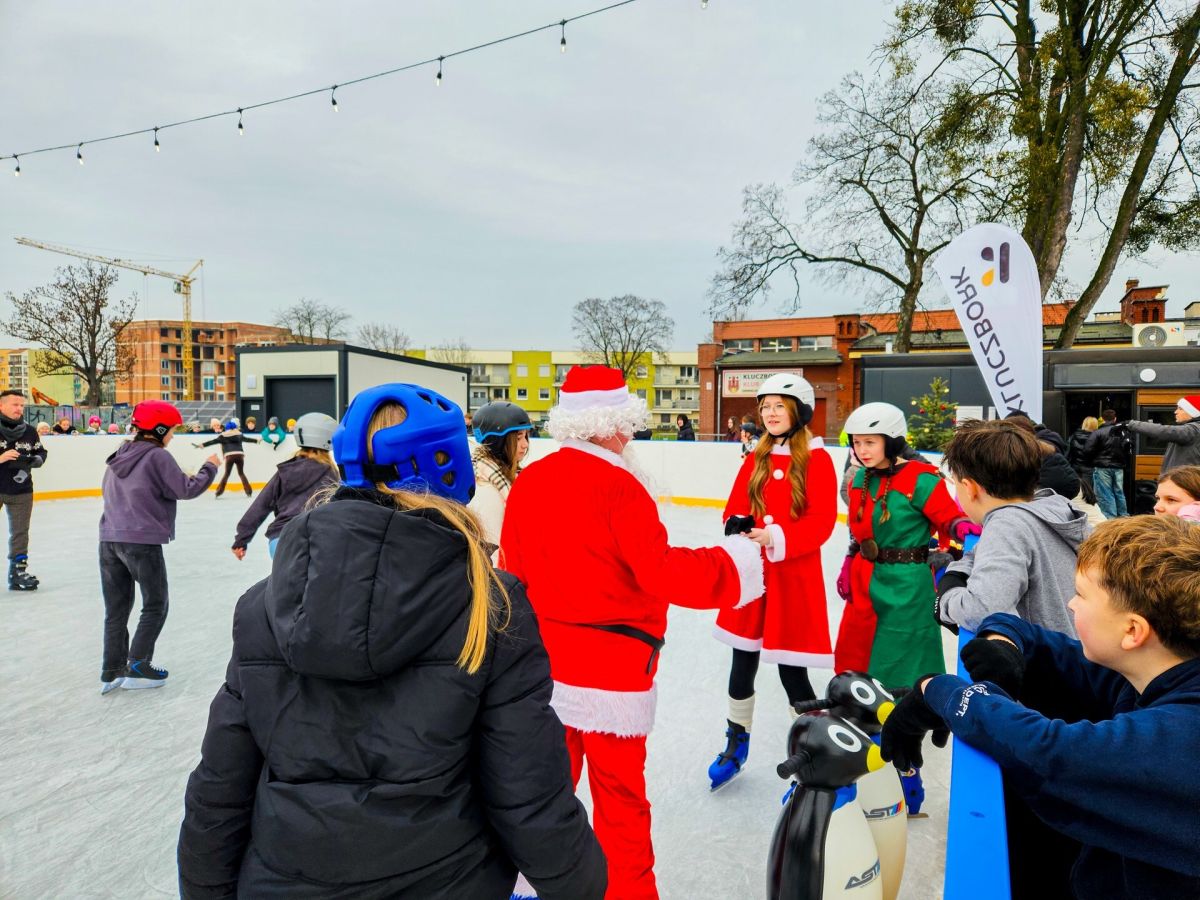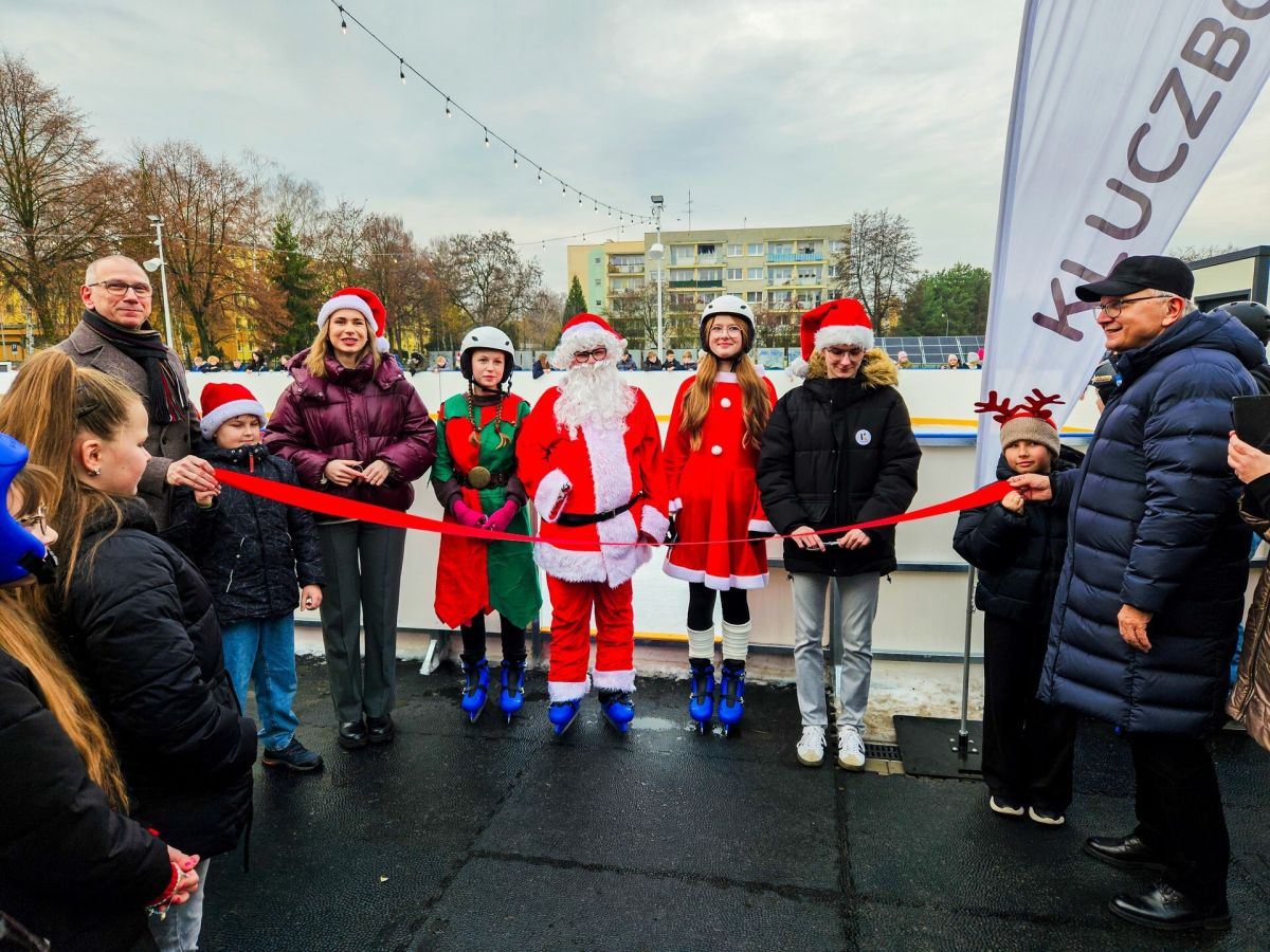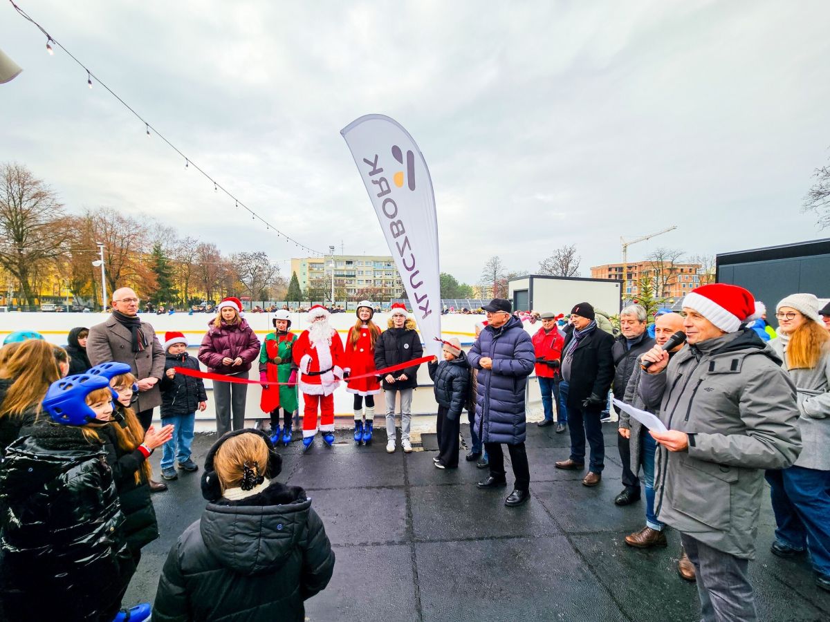 Po krótkim powitaniu i przemówieniu Burmistrza Jarosława Kielara, który podziękował wszystkim osobom zaangażowanym w realizację inwestycji oraz życzył bezpiecznej i radosnej jazdy na łyżwach, nastąpiło symboliczne przecięcie wstęgi! Wstęgę trzymali Burmistrz oraz Przewodniczący Rady Miejskiej, a przecięcia dokonali: Święty Mikołaj, elfy ze Szkoły Podstawowej nr 2 oraz przedstawiciele Młodzieżowej Rady Miejskiej.