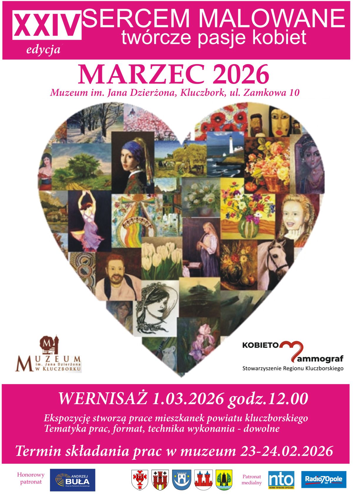 Stowarzyszenie Regionu Kluczborskiego "Kobietom-Mammograf" serdecznie zaprasza na wernisaż XXIV edycji wystawy "SERCEM MALOWANE - TWÓRCZE PASJE KOBIET", który odbędzie się w Muzeum im. Jana Dzierżona w Kluczborku 1 marca 2026 o godz. 12:00.