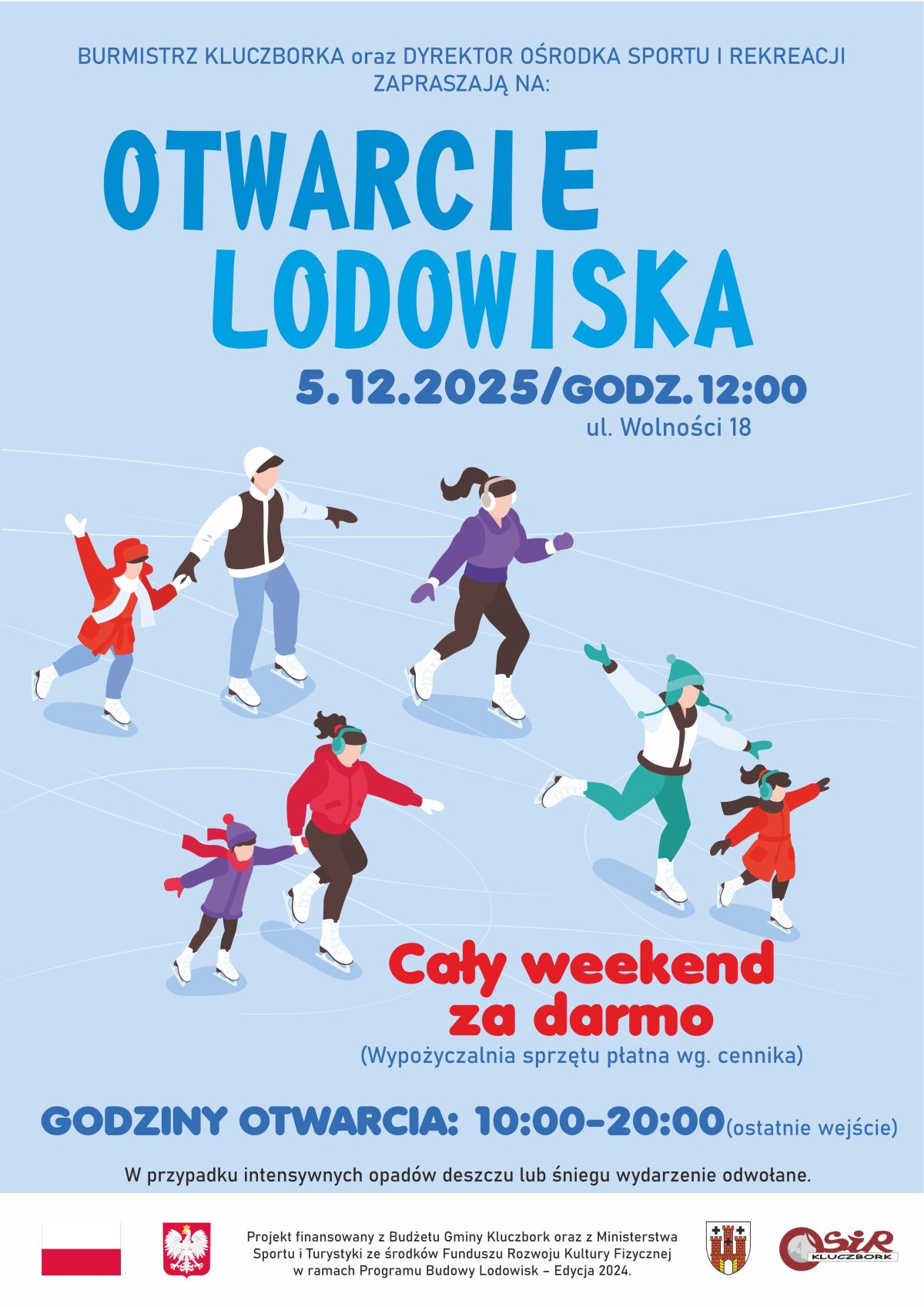W piątek 5 grudnia o godz. 12:00 otwieramy kluczborskie lodowisko przy ul. Wolności 18. Zapraszamy całe rodziny oraz wszystkich miłośników zimowej aktywności na świeżym powietrzu.