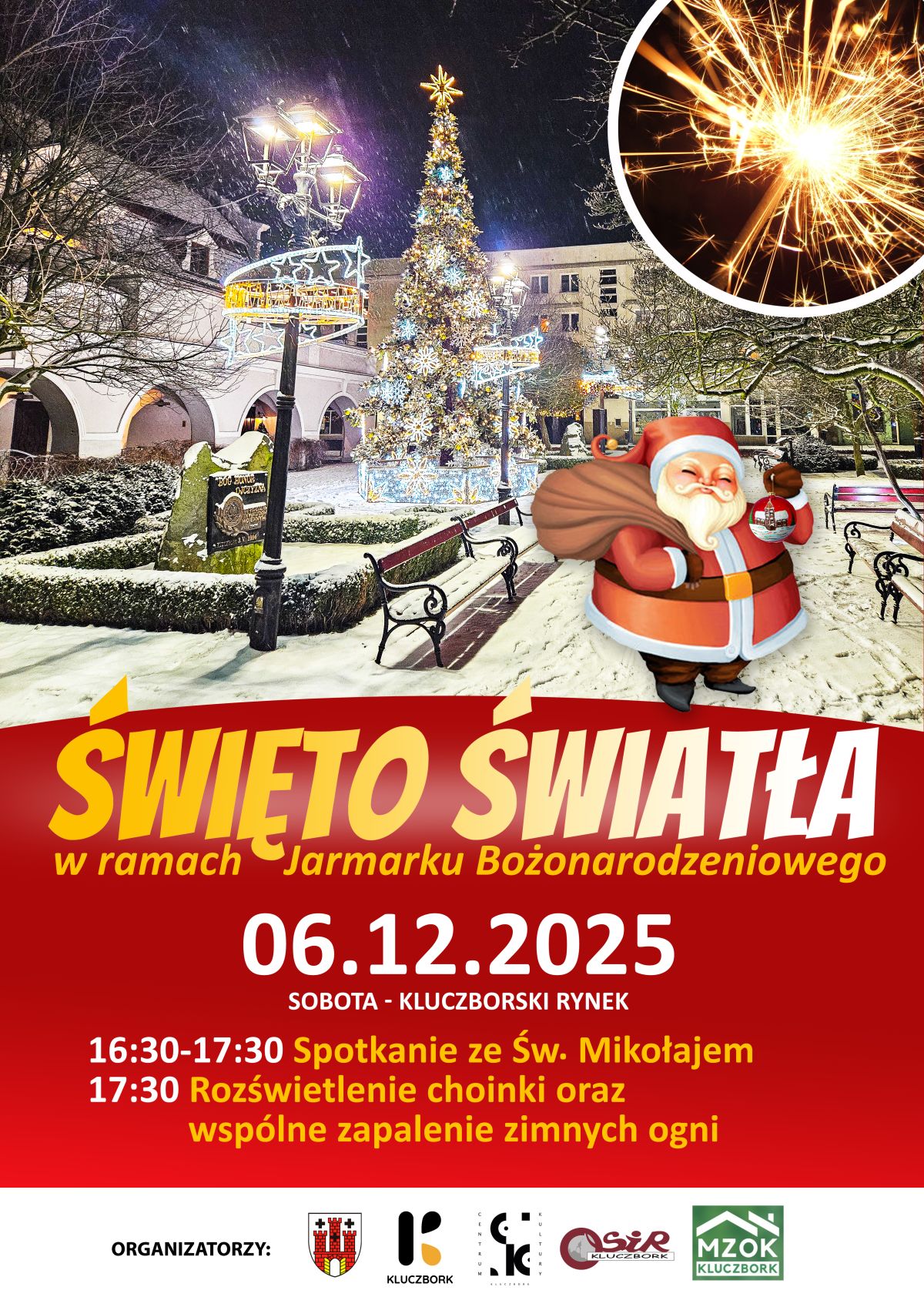 Na Rynku w Kluczborku czeka świąteczna atmosfera — światełka, dekoracje, zapachy i smaki świąt. Odwiedzający znajdą świąteczne ozdoby, rękodzieło, pierniki, grzane napoje i inne pyszności. W sobotę 6 grudnia odbędzie się spotkanie ze Świętym Mikołajem oraz uroczyste rozświetlenie miejskiej choinki w ramach Święta Światła. W programie przewidziano także koncerty i występy artystyczne.