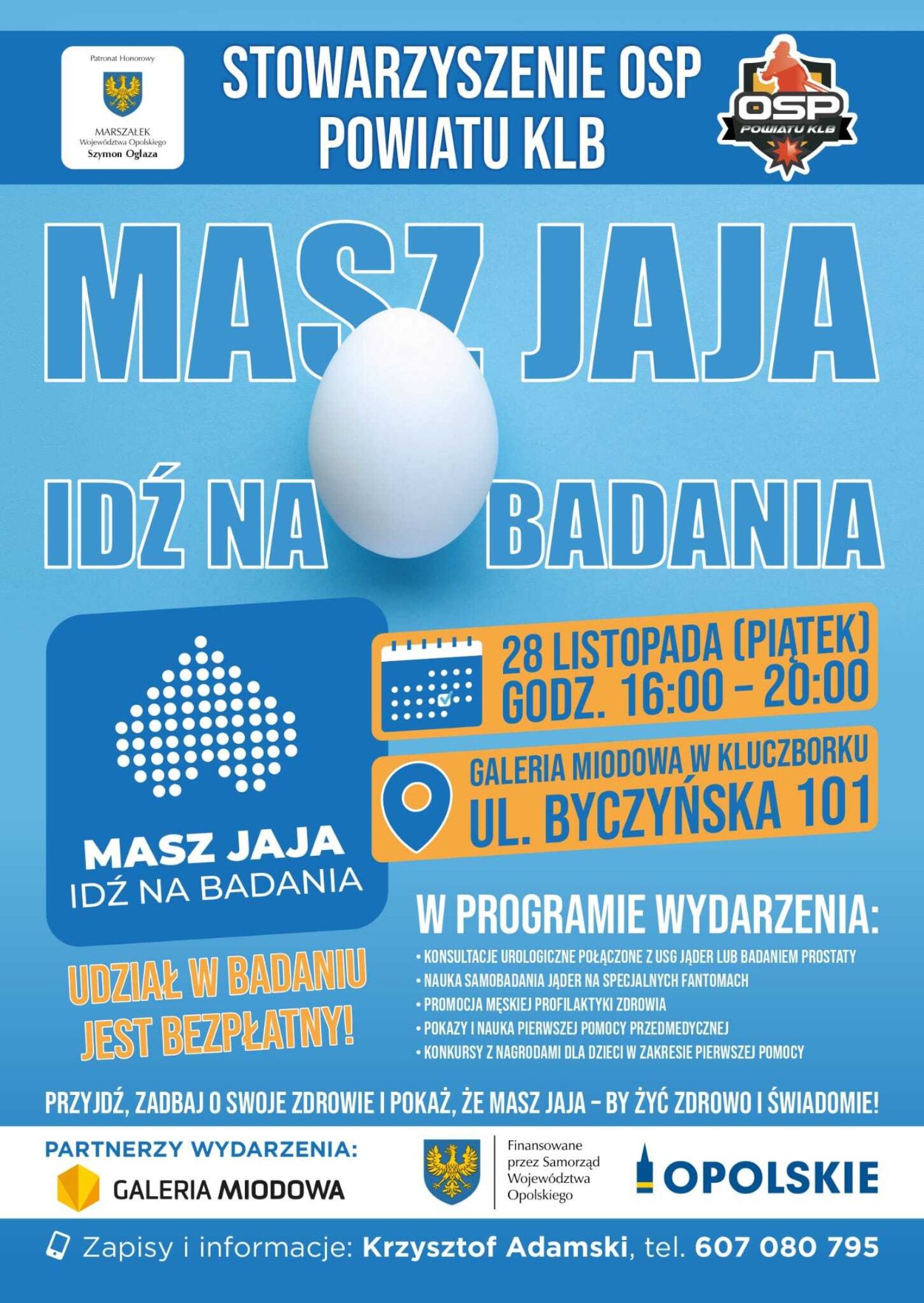 Stowarzyszenie OSP powiatu kluczborskiego serdecznie zaprasza wszystkich panów – i ich bliskich – do udziału w akcji „MASZ JAJA, IDŹ NA BADANIA!!!”, która odbędzie się w piątek, 28 listopada, w godzinach 16:00–20:00 w Galerii Miodowej w Kluczborku (ul. Byczyńska 101).