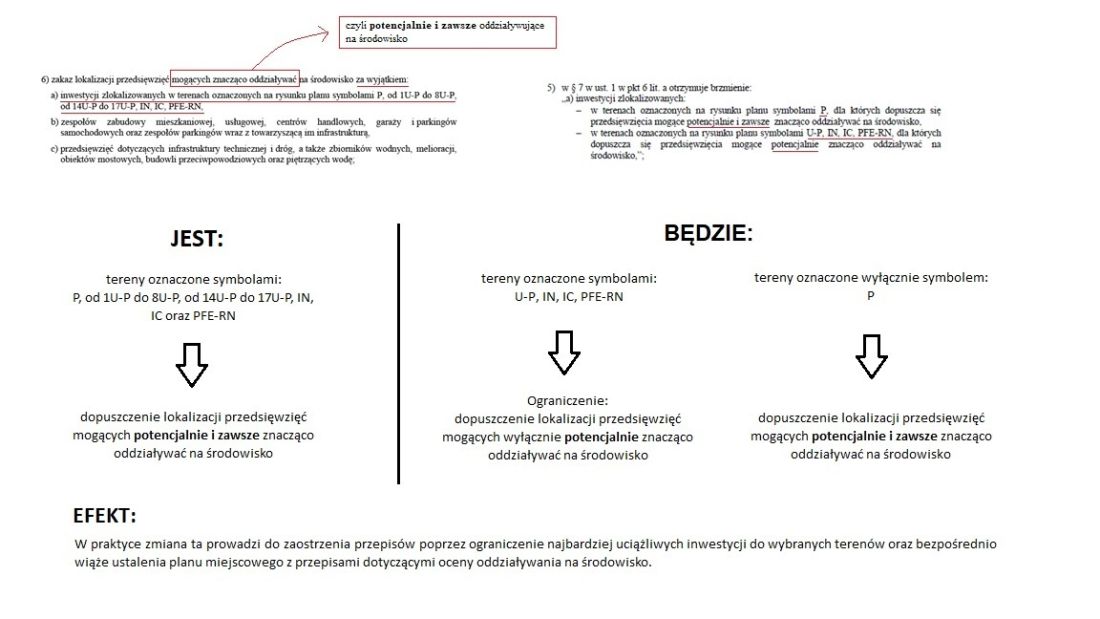 Celem uchwały jest ograniczenie przedsięwzięć mogących zawsze znacząco oddziaływać na środowisko na terenach oznaczonych na rysunku planu symbolami: od 1U-P do 8U-P, od 14U-P do 17 U-P, IN, IC, PFE-RN.